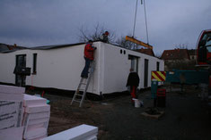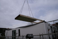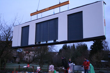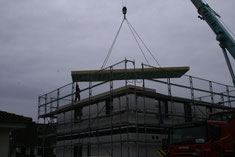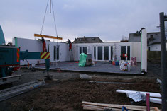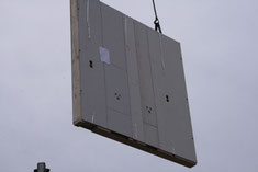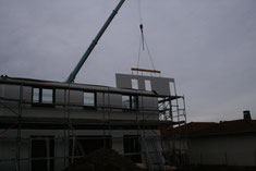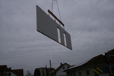 Die erste Wand schwebt vom LKW Richtung Bodenplatte, es ist ca. 7:30 Uhr. Wir sehen die Seite im Erdgeschoß zum Garten hin. Beteiligte: 1 Kranführer und 4 Bien-Zenker-Mitarbeiter. Jeder weiß genau, was zu tun ist.