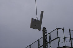 Bald schwebt das Deckenteil mit dem Treppenausschnitt über uns und gleichzeitig wächst das Baugerüst.