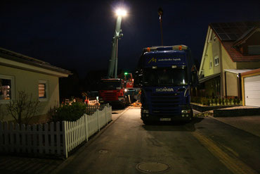 Die Ersten sind um 5:30 Uhr da, der Kran wird aufgebaut. Die Kolonne rückt später nach und bereitet die Bodenplatte auf. Dazu haben sie so etwas wie Höhlenlampen auf dem Kopf. 6:10 Uhr ruft der Polier nach Strom und Wasser. Kriegt er, ist ja alles vorbereitet.