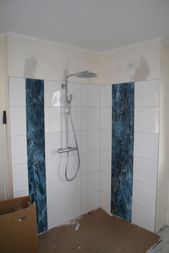 Anfangsstadium der Fliesenaktion in der großen Dusche. Zu sehen sind schon die großen Glasplatten, die ergänzt werden durch weiße große Fliesen. Das wird sich dann in den Fliesen an der Badewanne, in viel kleinerem Format natürlich, wiederholen.