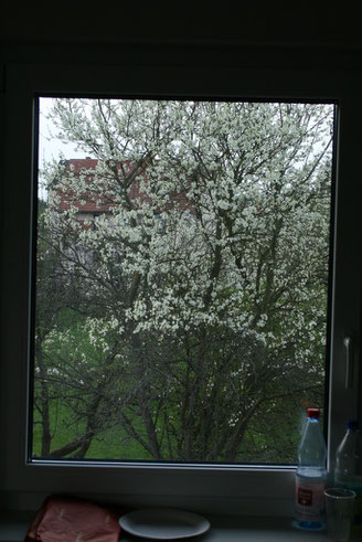 Während drinnen die Bauherren sich Zimmer um Zimmer vorkämpfen, schlägt draussen der Frühling aus. Diesen Blick aus dem Schlafzimmerfenster rüber zum Nachbarn gönnt man sich dann ab und zu als Pause.