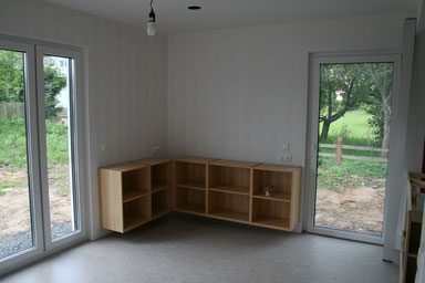 Die vor etwa 2 Jahren zugekaufte Ecklösung der Wohnküche wurde von Anfang an in den Bauplan mit integriert. Darüber kommt als Arbeitsplatte demnächst noch die kleine Schwester der Küchenarbeitsplatte und in den Regalen wird einiges an Geschirr im direkten Zugriff stehen.