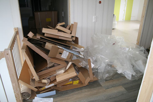 Esszimmer und Wohnzimmer von den großen Kartons mit Möbeln und der Zusatzcouch befreit, so dass nun der Flur wieder voller ist.