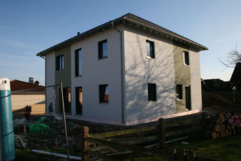Am Tag der Hausübergabe (10.3.) kam auch das Gerüst ab. Nun wartet alles nur noch auf Strom, den Innenausbau und die Aussengestaltung. Vor allem aber darauf, dass der Estrich trocken genug ist, denn sonst kein Tapezieren und kein Fussbodenbelag, ohne Fussbodenbelag keine Türen und ohne Türen kein Einrichten der Heizung.