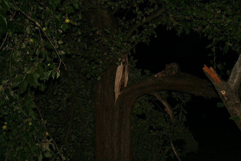 liegt der halbe Apfelbaum waagerecht. Was im Dunkeln dann nich nicht so genau auszumachen war, stellt sich bei Tage als leichter Kahlschlag heraus. Teile des Kirsch- und Pflaumenbaums sind
