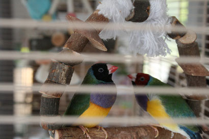 Um uns besser unterscheiden zu können, haben wir Goldamadinen unterschiedlich farbiges Kopfgefieder. Karl geht im satten schwarz, während Friedrich rot schöner fand.