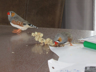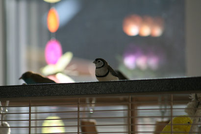 Wir vom Stamm der Zebrafinken sind auch schon von Anfang an dabei. Der größere von beiden ist der Rudi, Hans ist etwas kleiner geraten. Am Anfang haben wir noch in das gleiche Nestchen gepasst, aber jetzt braucht jeder von uns sein eigenes.